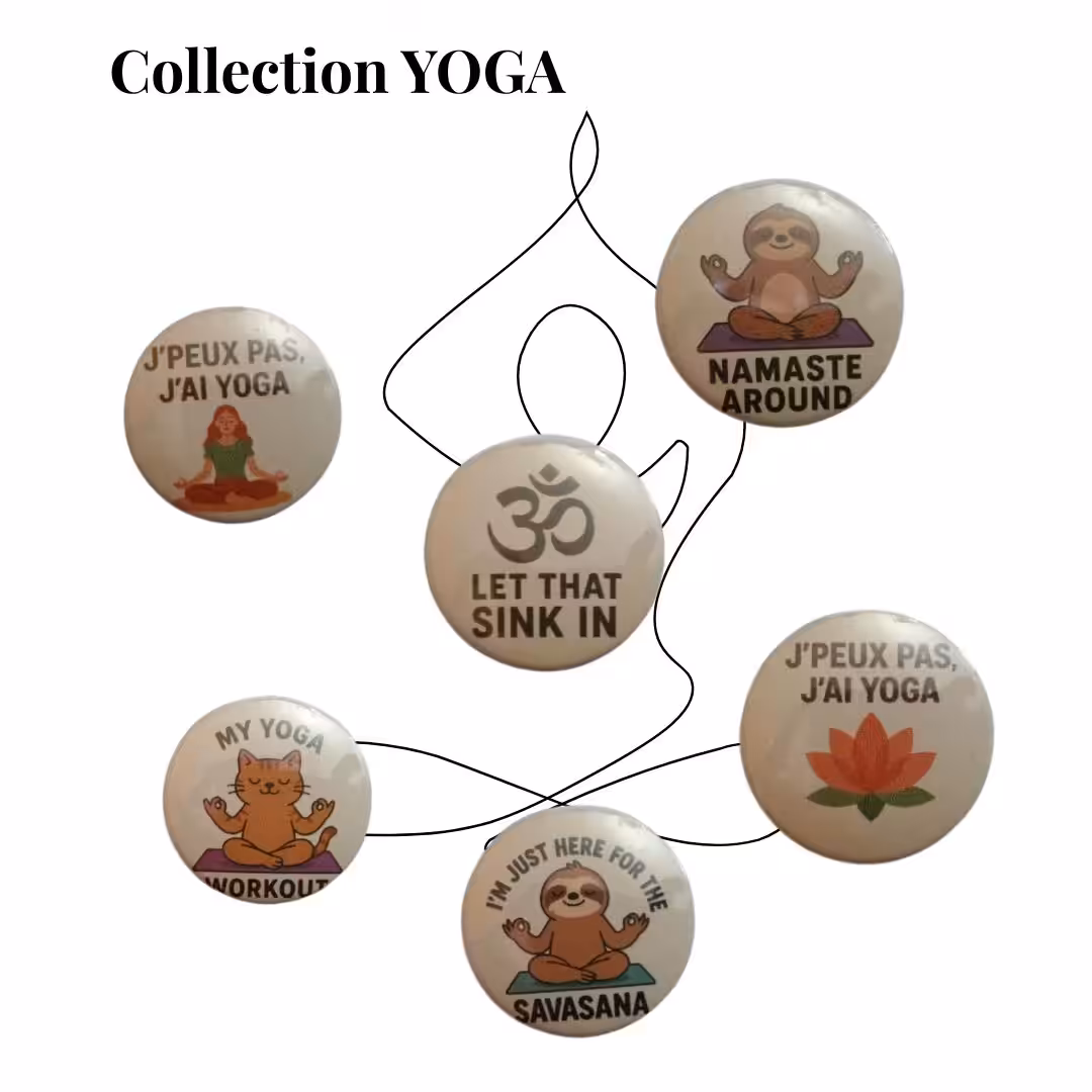 Collection existante ici : choisissez parmi notre collection de badges les visuels déjà inventés, créés, imprimés (mandalas, yoga, humour, féminisme, animaux, citations…)