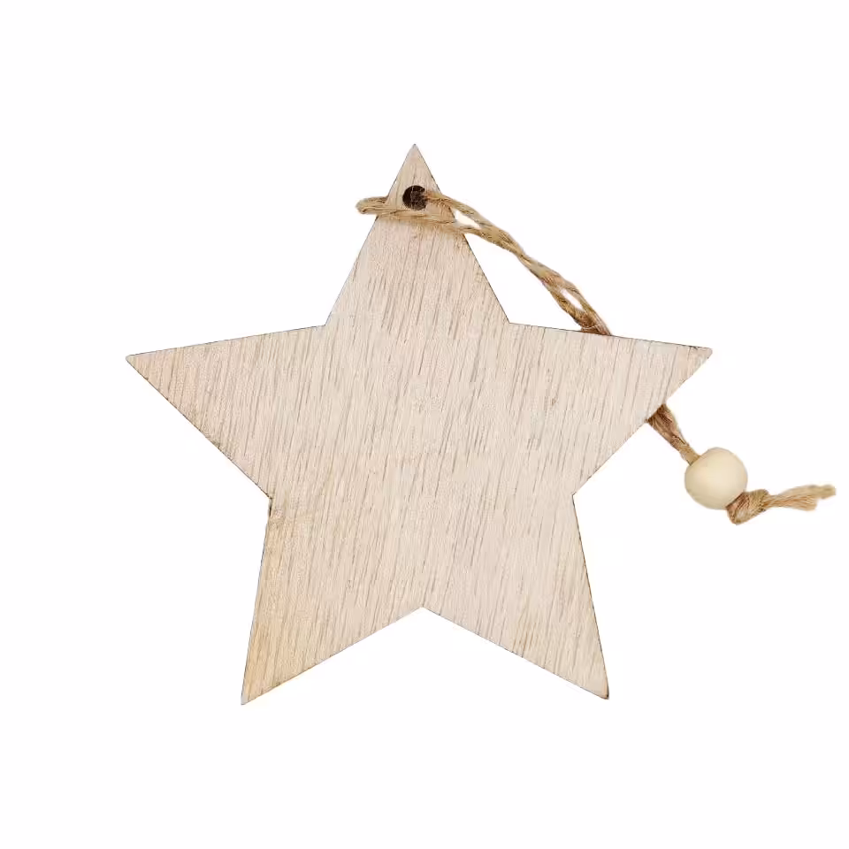Apportez une touche authentique et personnelle à votre sapin avec cette belle décoration de Noël en bois, en forme d’étoile. Son design simple et naturel, associé à une ficelle rustique ornée d’une perle, en fait un élément décoratif idéal pour une ambiance chaleureuse et festive. Personnalisable avec un texte, une image ou un motif de votre choix, cette étoile ajoutera une touche unique à vos fêtes.