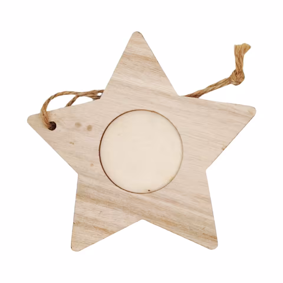 Ajoutez une touche personnelle et unique à votre sapin de Noël avec cette décoration en bois en forme d’étoile, dotée d’un emplacement central pour une photo. Grâce à la technique de sublimation, vous pouvez insérer une photo ou une image personnalisée, ce qui en fait un souvenir spécial pour les fêtes. Suspendue avec une ficelle en jute, cette étoile est à la fois rustique et élégante, parfaite pour ajouter une touche de chaleur à votre décoration.