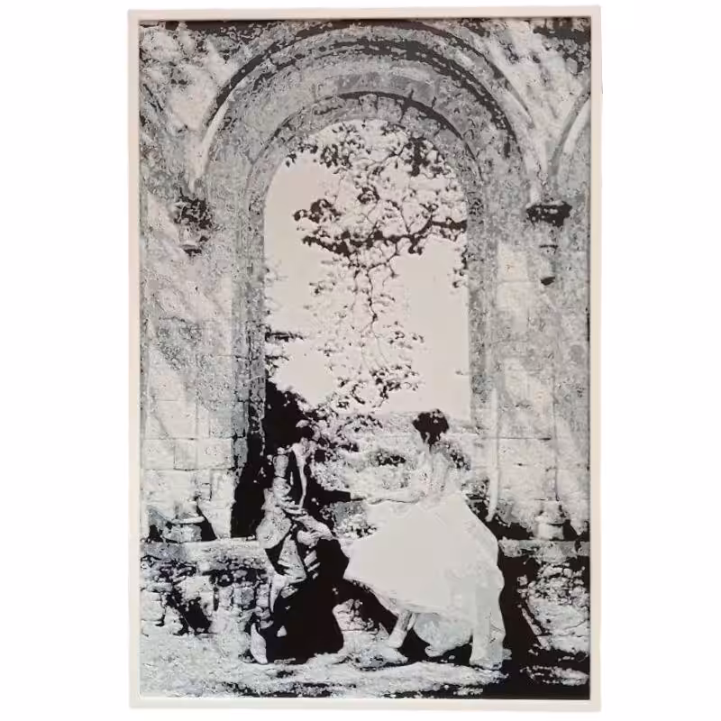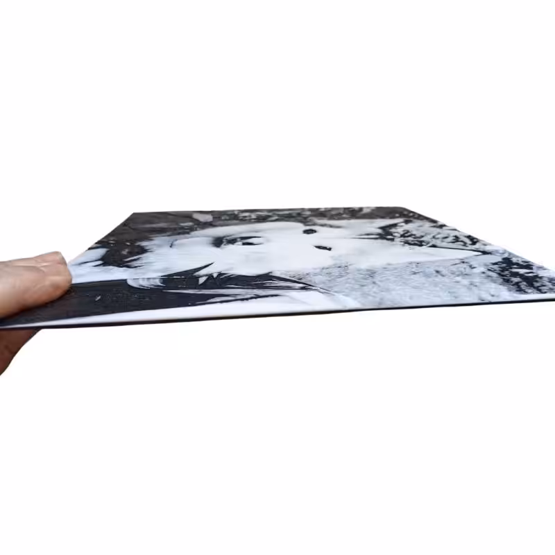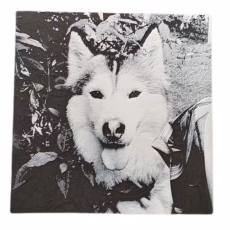 texture en relief : l’impression recrée les détails de votre photo en jouant sur la hauteur de la matière. Les zones claires (blancs) sont imprimées avec une texture granuleuse et saillante, tandis que les zones sombres (noirs) restent plus lisses et en creux.